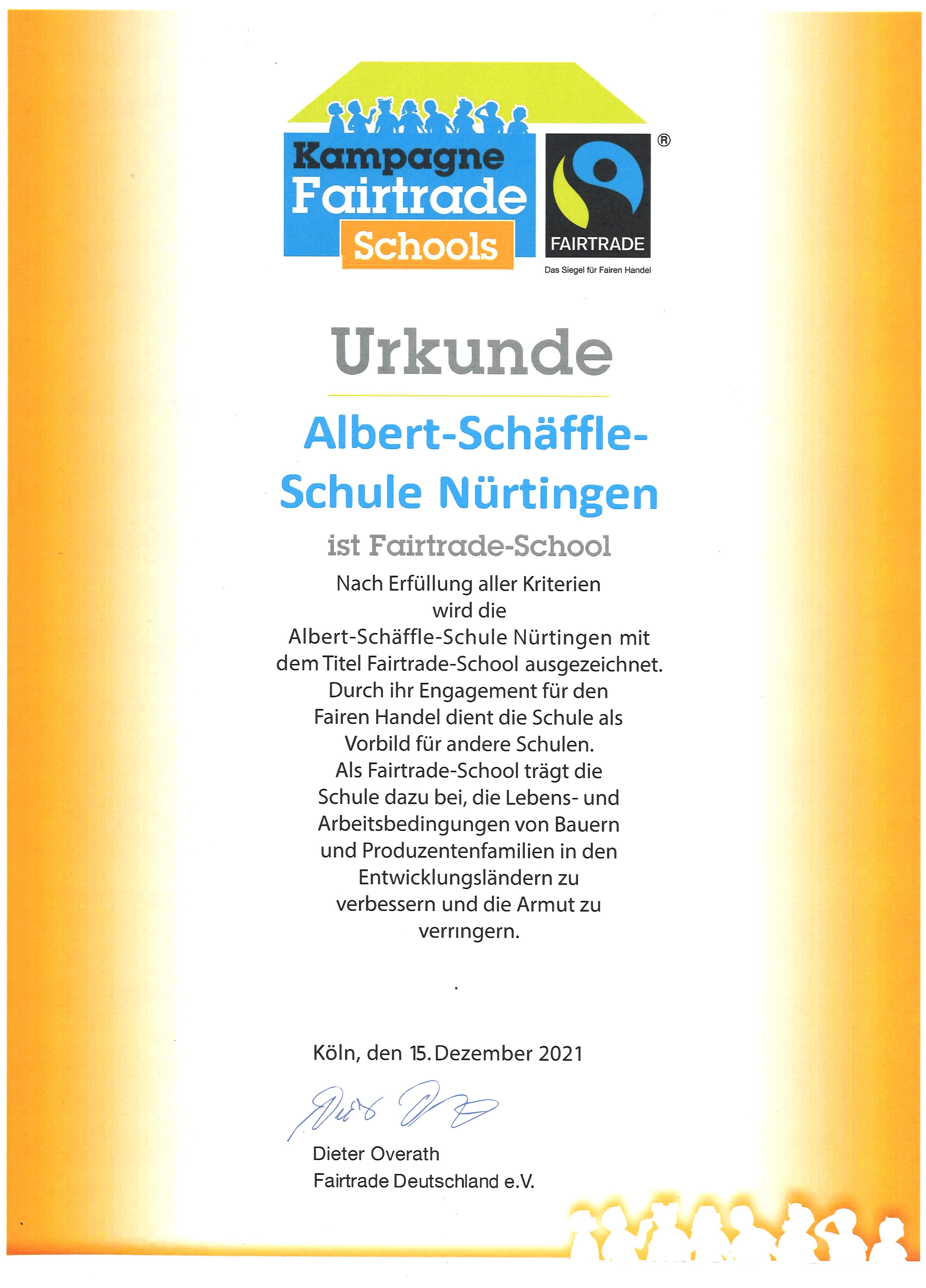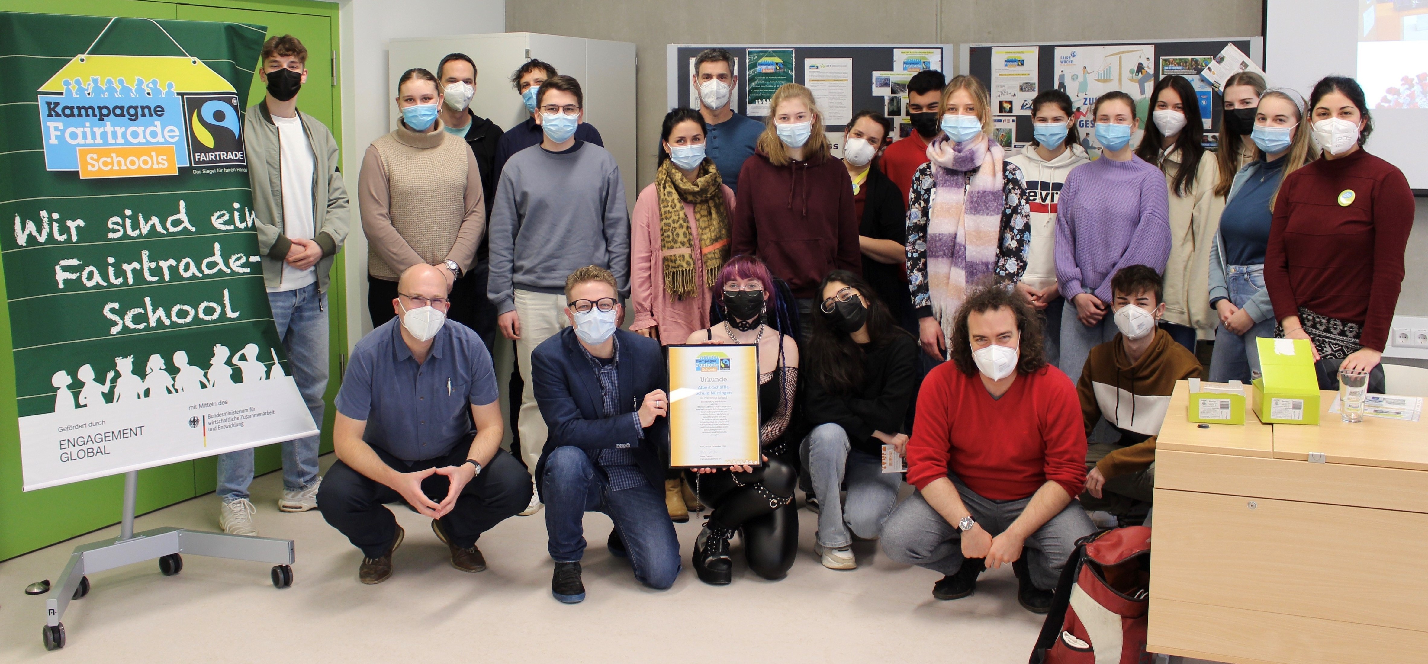 Als kaufmännisch / wirtschaftswissenschaftlich ausgerichtete Bildungseinrichtung ist die Albert-Schäffle-Schule geradezu prädestiniert, sich mit Fragen zu Fairem Handel, Nachhaltigkeit, gerechten Wirtschaftsstrukturen, globalen Handelskontexten etc. auseinanderzusetzen und sich somit lange bekannten, zunehmend ‚brennenden‘ Themen (z.B. Klima- und Migrationskrise) zu stellen. Am 15. Dezember 2021 wurde die ASS offiziell als Fairtrade-School ausgezeichnet. Als solche hat unsere Schule folgende fünf Kriterien im Blick: