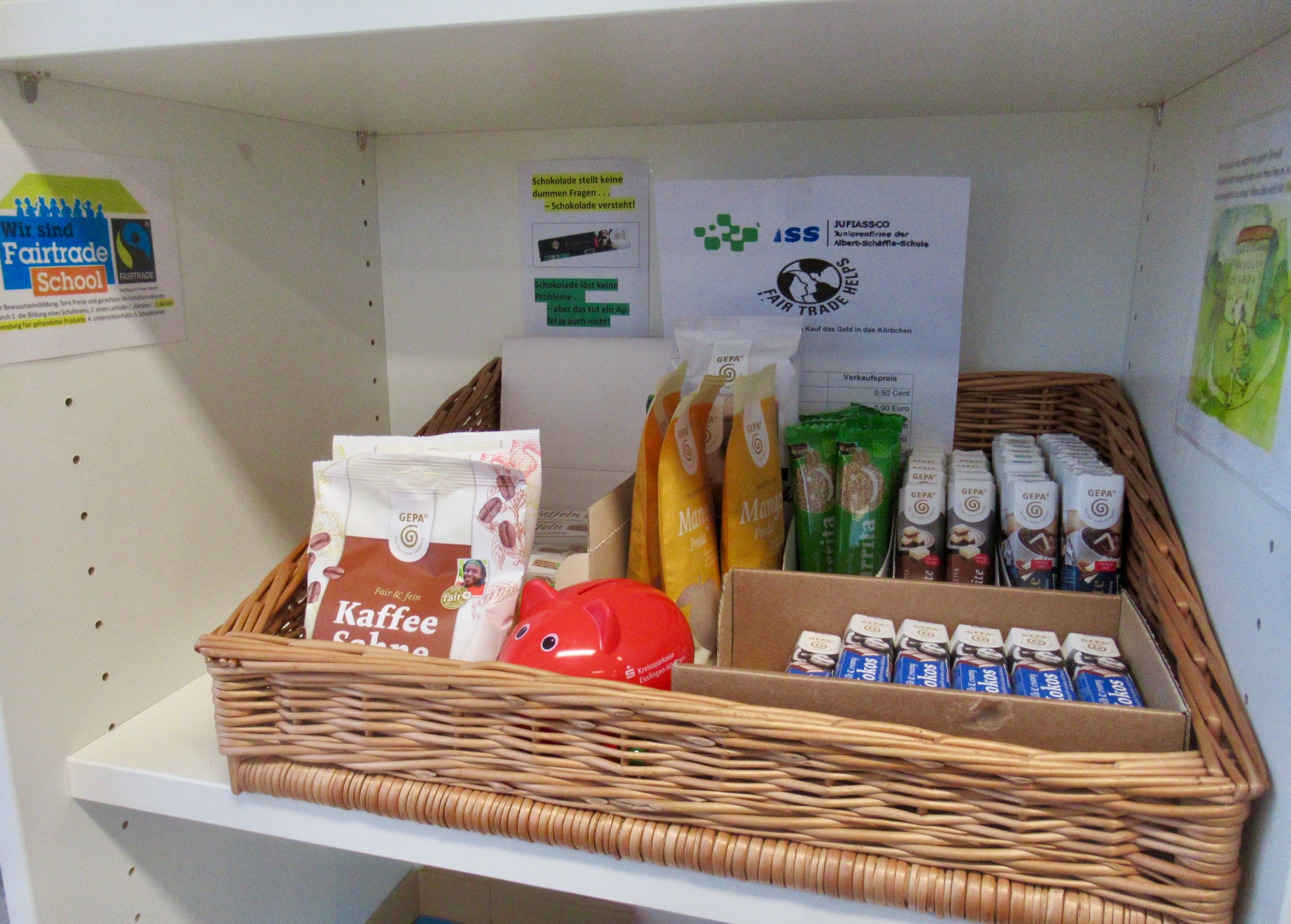 An unserer Schule übernimmt den Ein- und Verkauf fair gehandelter Produkte die Juniorenfirma Jufiassco, welche im Lehrerzimmer und am Pausenverkaufsstand ihr Sortiment anbietet – die Kaffeemaschine im Lehrkräfte-Sozialraum wird ebenfalls mit fair gehandelten Bohnen beliefert.
