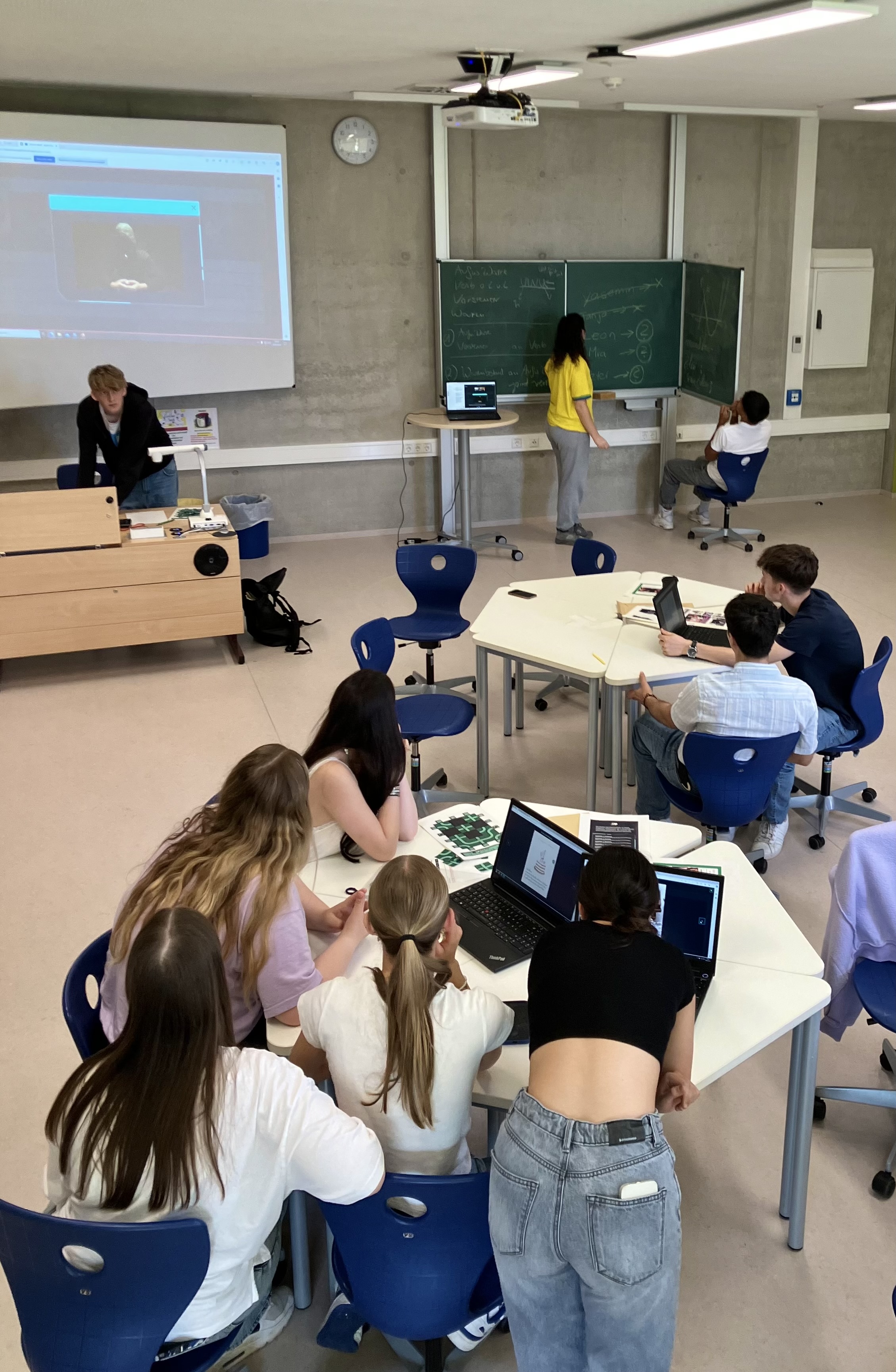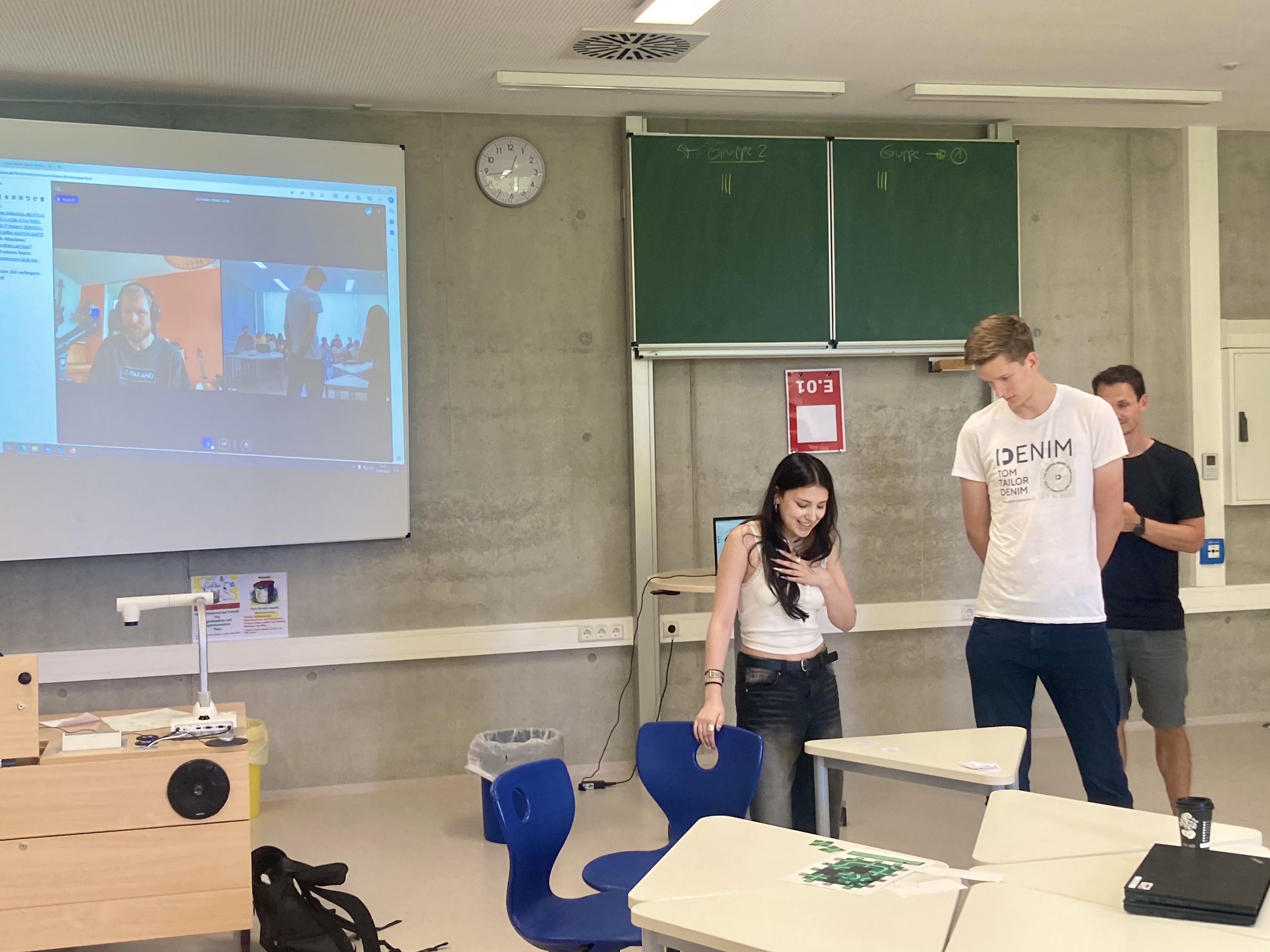 Dabei kamen wir mit wenig Hilfe von Max aus und lagen auch gut in der Zeit. Dies lag vor allem daran, dass wir uns den Herausforderungen als Gruppe stellten und dass die verschiedenen Teilgruppen nicht gegeneinander, sondern miteinander arbeiteten. Denn immer, wenn ein Team Schwierigkeiten hatte, kommunizierten wir im Sinne des Fair Plays miteinander, um gemeinsam den Angreifer zu stoppen. So kamen wir nicht nur schneller mit den Rätseln voran, sondern das brachte unsere Klasse auch näher zusammen. Aber vielleicht am besten war, dass durch die kleinen Gruppen jeder wirklich aktiv dabei war und durchgehend mitknobelte. Jedes Gruppenmitglied konnte wirklich etwas bewirken und niemand war einfach nur so dabei.