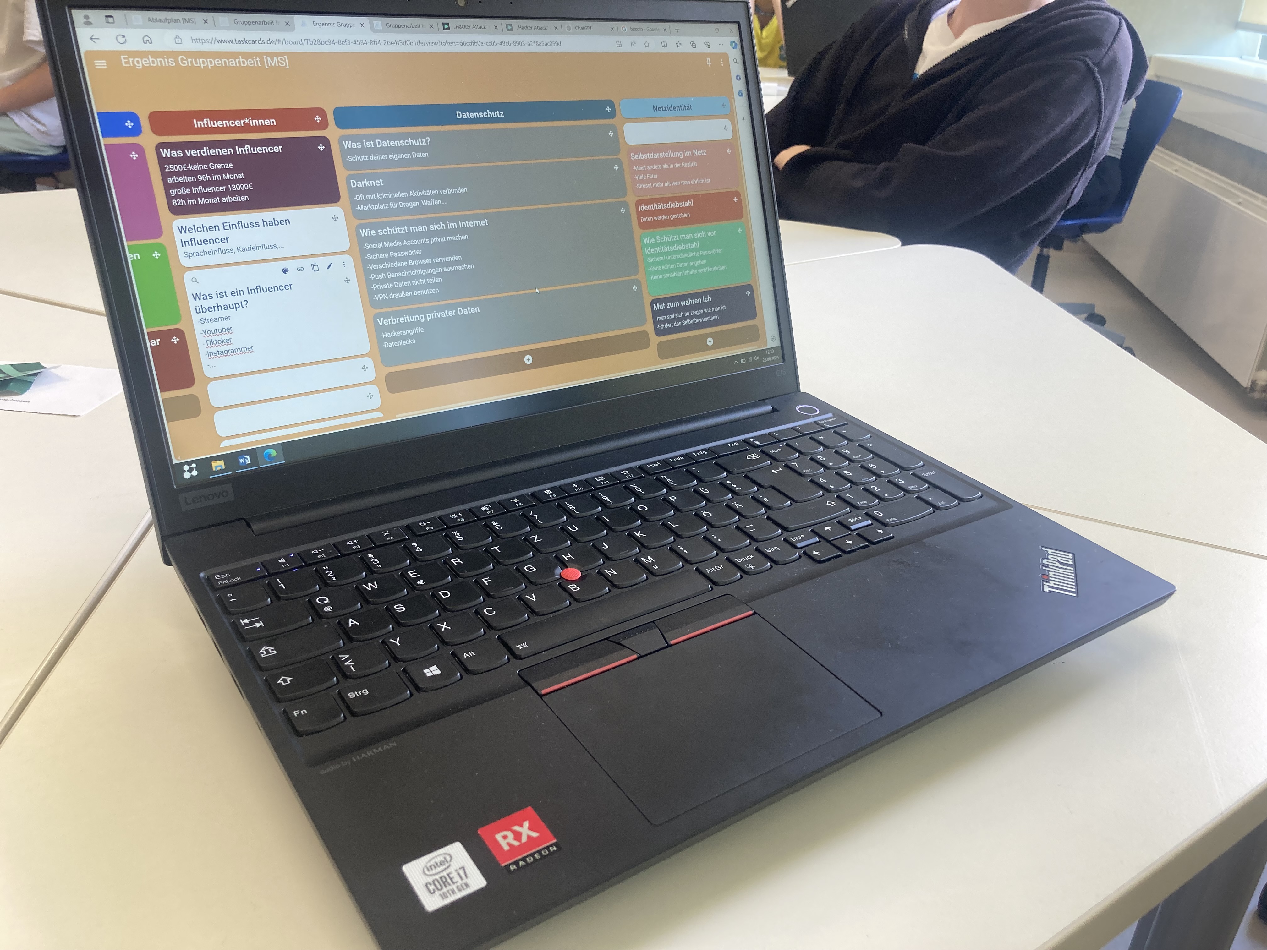 Mit dem Escape Room war dieses besondere Event allerdings noch nicht vorbei. Nach einer Pause wurde jeder Gruppe ein Thema zugeordnet, in welchem wir dann zu Experten wurden. Die Themen waren Fake News, Werbung und Hass im Netz, Influencer, Datenschutz und Netzidentität. Aus Videos und Internetseiten verschafften wir uns zunächst einen Überblick, arbeiteten die wichtigsten Informationen heraus und fassten diese dann auf einer Seite des Dashboards zusammen. Dafür erhielten wir 40 Minuten Zeit und brachten die Lerninhalte anschließend unsern Mitschülern mit einem Vortrag näher. Beispielsweise besprachen wir, wie man Fake News erkennen kann und wie man sich online schützt, sei es mit einer Antivirus-Software oder einem VPN-Schutz.