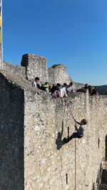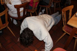 Nachdem wir unsere Koffer verstaut hatten, machten wir es uns erst einmal in unserem neuen Zuhause gemütlich. Währenddessen bereiteten Herr Wenzel und Herr Nagler die sog. Klassenolympiade vor. Dabei absolvierten wir den Nachmittag über ganz verschiedene Disziplinen in vier zufällig ausgewählten Teams gegeneinander. Ziel war es, dass wir eng zusammenarbeiten, wobei jeder von uns die Chance hatte, seine Stärken zu zeigen. Zum Beispiel mussten wir uns durch ein sog. Spinnennetz schlängeln, ohne die Spinnenweben zu berühren. Bei der Disziplin „Lügenbaron“ mussten wir aus einer detaillierten Geschichte die eingebauten Fehler finden. Sehr lustig war auch die Disziplin „Sonntagsschauspieler“, als immer zwei Schüler einen Begriff pantomimisch vorspielten, den der Rest der Gruppe erschließen musste. Darunter waren so absurde Begriff wie Känguruh, Rasenmäher oder Waschmaschine. Können Sie sich vorstellen, das ohne Worte darzustellen? Geschicklichkeit und Koordination war gefragt in der Disziplin „Dreibeinrennen“, als zwei Mitglieder jeder Gruppe mit jeweils einem Bein aneinander gebunden wurden und dann möglichst schnell eine festgelegte Strecke durch unser Forsthaus hüpfen mussten. Eigentlich waren auf der Wiese unterhalb der Burg noch viele weitere solcher aktiver und sportlicher Disziplinen geplant, aber da machte uns der kalte Nieselregen einen Strich durch die Rechnung. Wahrscheinlich war das der Grund, dass am Ende das Team „Alpha“ – nomen est omen - die Klassenolympiade für sich entschied. Ihre Belohnung sollte am nächsten Tag bei der Konkurrenz der „Tannenzäpfchen“ und „Spartacus“ für neidische Gesichter sorgen.