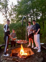 Dort angekommen, entschied sich die Kochgruppe für uns alle zu grillen und lieferte uns dann Fleisch, Würstchen und Gemüse frei Haus in den Speisesaal. Manchen besonders Hungrigen ging der Lieferservice allerdings zu langsam, so dass sie sich spontan selbst etwas in der Küche brutzelten. Nach dem Abendessen öffnete für viele Jungs die Fanzone. Denn sie schafften es tatsächlich, eine stabile Internetverbindung aufzubauen, so dass wir den Champions League-Kracher „Real Madrid gegen die neue Macht im europäischen Fußball – VfB Stuttgart“ über den mitgebrachten Beamer anschauen konnten. Alle Nicht-Fußballfans genossen derweil den gemeinsamen Abend mit lauter Musik und gemeinsamen Gesprächen im allseits beliebten Mädchen-Zimmer.