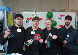 Die ÜFA-Messe stellte sich als ein Projekt heraus, das jede Menge Vorbereitung verlangt. Schon einige Wochen zuvor besuchten wir unsere Patenfirma Metabo für eine sorgfältige Produktschulung. Dabei lernten wir en Detail die Besonderheiten unserer Ausstellungsartikel mit möglichen Verkaufsargumenten. Außerdem galt es vor der Messe zu planen, wie wir unseren Stand möglichst ansprechend gestalten und welches Outfit sich als Verkäufer eignet. Nicht zuletzt bereiteten wir ein Gewinnspiel vor, mit dem wir die Interessenten zu unserem Stand locken wollten. Am Tag vor der Messe musste noch viel aufgebaut werden, wie Stehtische, Infotafeln und Steckwände. Zum Glück wussten die Lehrer genau, wo was hinmusste, so dass der Aufbau systematisch und effektiv ablief. Das nennt man wohl Profi-Erfahrung.