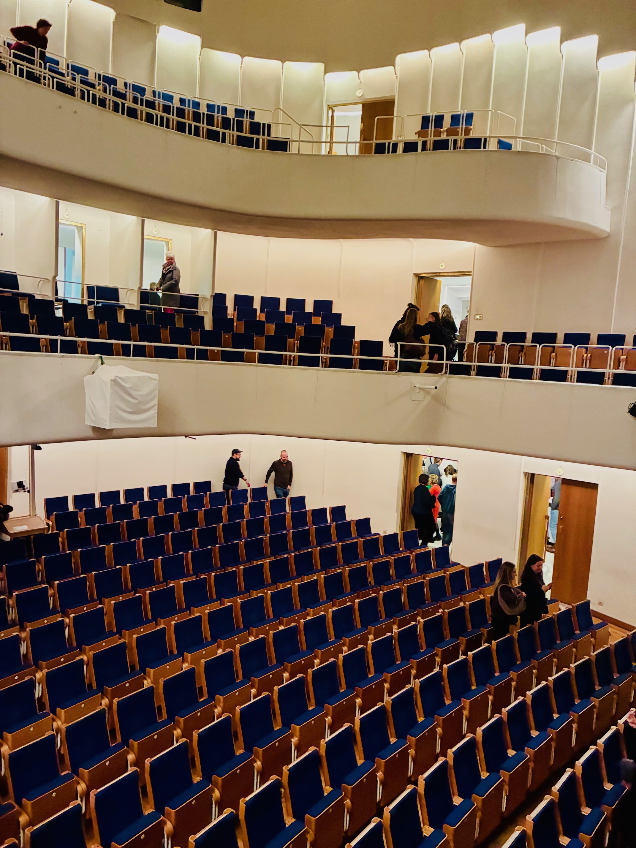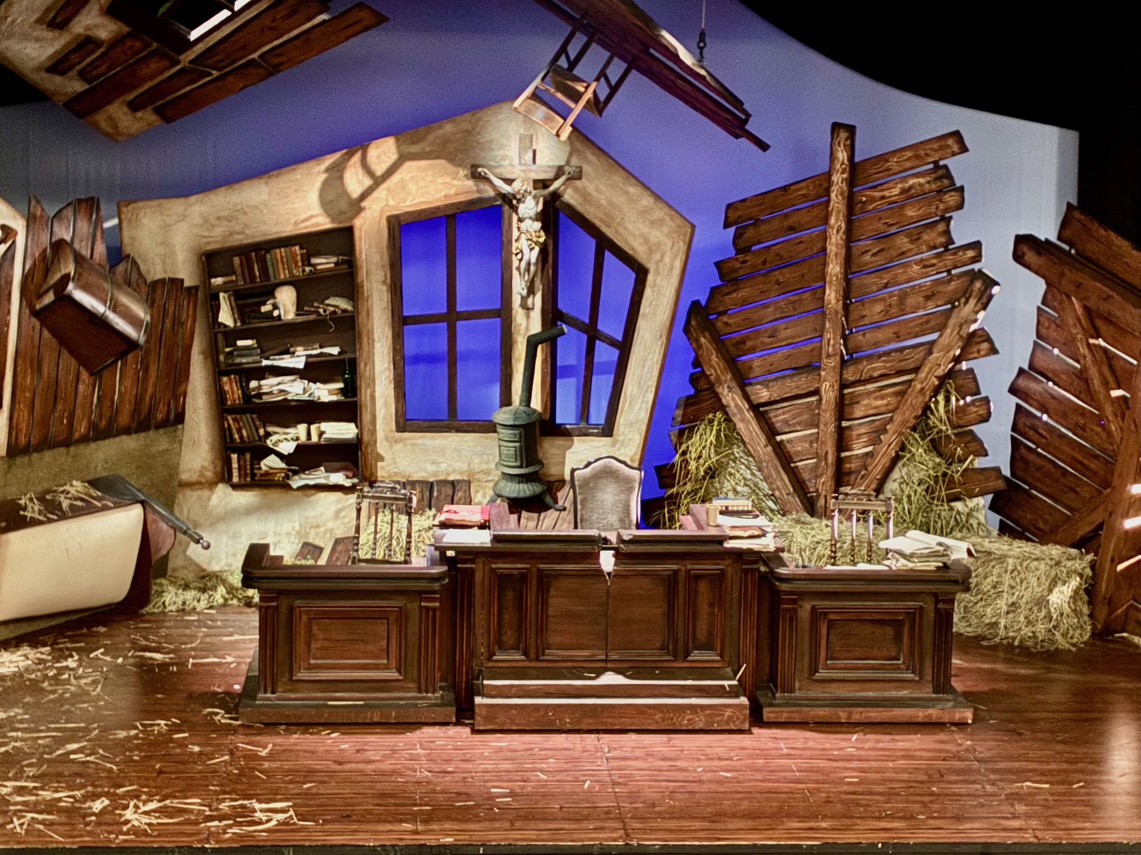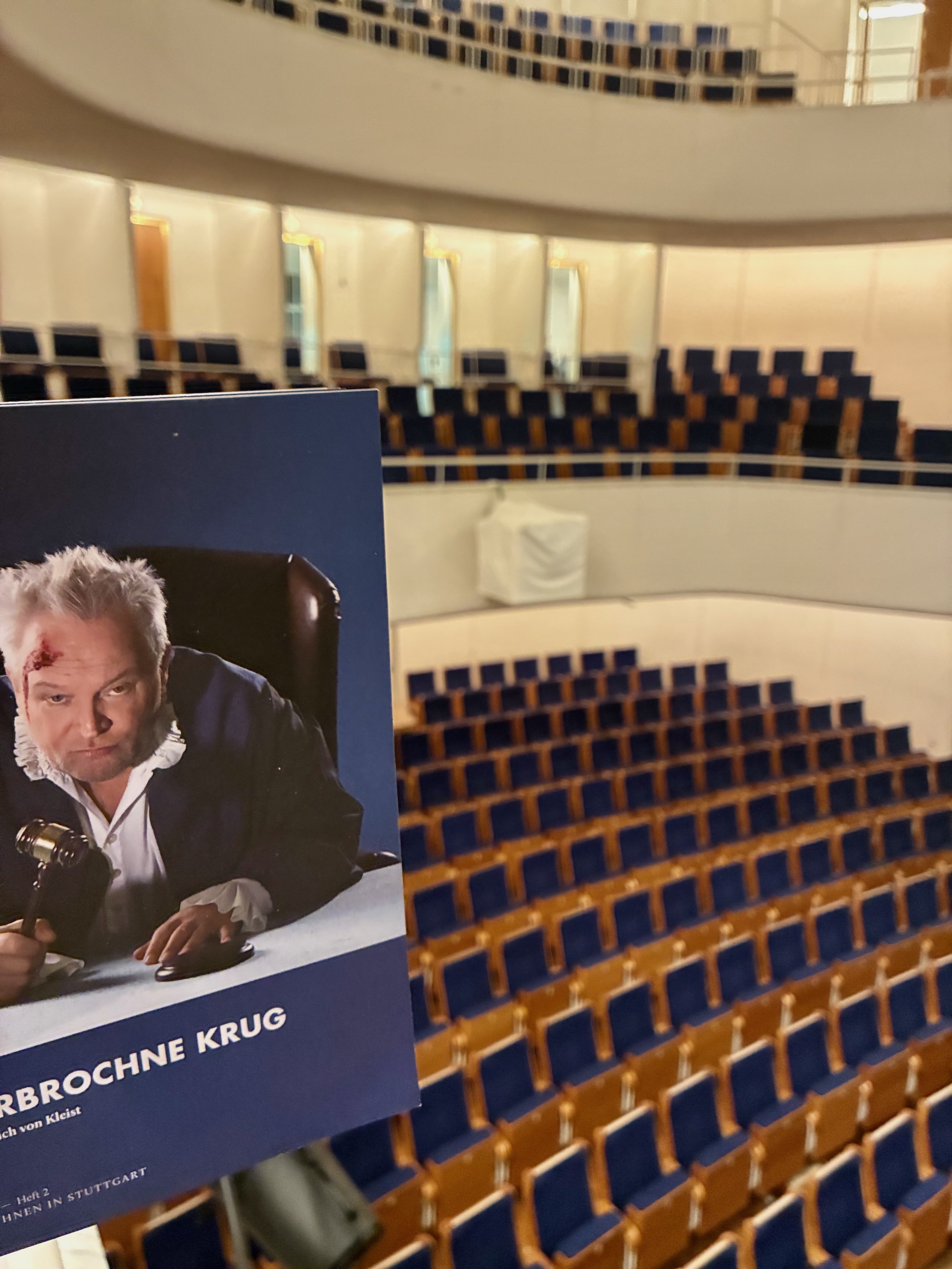 Das Alte Schauspielhaus in Stuttgart ist ein kleines, historisch charmantes Theater. Der Aufführungssaal erstreckt sich über drei Etagen und in der zweiten Etage befindet sich eine Bar. Auch das Bühnenbild gefiel uns, da es die Dramenhandlung schön veranschaulichte: So gab es einen großen Richtertisch, Schneespuren an der Wand, Strohballen auf dem Boden sowie schräg aufgestellte und aufgehängte Möbelstücke, die symbolisierten, was für eine Unordnung in Adams Gericht herrscht und dass Recht und Gerechtigkeit hier aus dem Gleichgewicht geraten sind. Sogar der alte Kaminofen im Hintergrund gab ab und an Dampfwolken von sich.