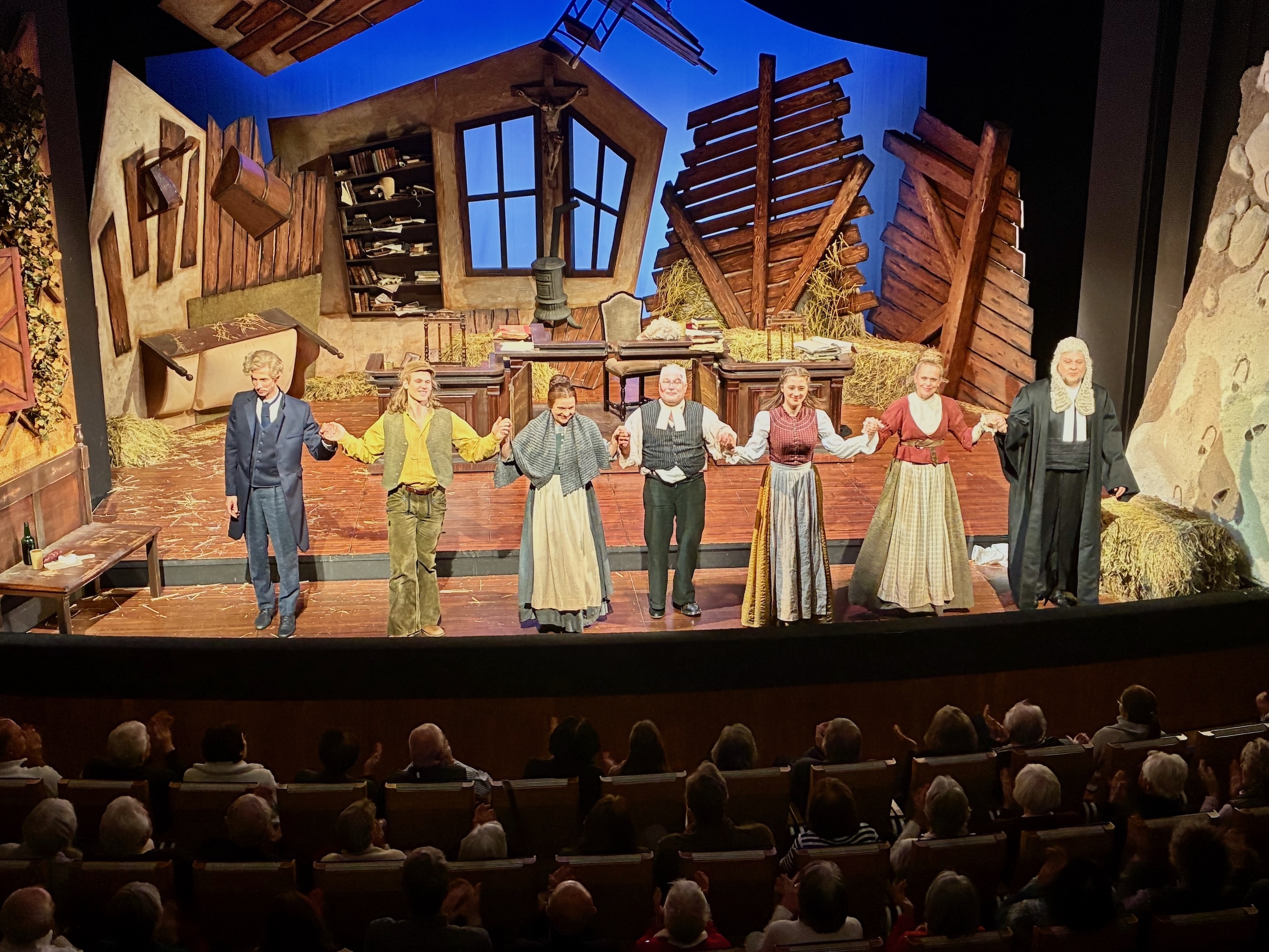 Nach der Pause wurde das Theaterstück fortgesetzt und, wie sagt man so schön: „Das Beste kommt zum Schluss.“ Denn als sich das Stück dem Ende zuneigte, wurde es noch einmal aufregend, da das Drama seine Wendung nahm. Als Zuschauer, der das Stück nicht kennt, mag man bis dahin gedacht haben, dass im Gerichtsstreit der eigentlich unschuldige Ruprecht verurteilt wird. Doch stattdessen wurden die Lügen des Dorfrichters Adam immer skurriler, ehe die Nachbarin, Frau Brigitte, und der Schreiber Licht den wahren Täter enttarnten. Obwohl wir das Stück kannten, war dieses Ende für uns das Beste, da man so schön dabei zusehen konnte, wie Adam Stück für Stück auffliegt und die Liebe zwischen der bemitleidenswerten Eve und ihrem impulsiven Verlobten Ruprecht doch noch möglich wird.